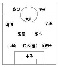 *→ 滝川と大岡のオーバーラップからの鋭いセンタリングと、沼間→大川の縦のラインが主な攻め手。だが生憎とスタメンFWに長身のヘディング要員がいない(山口も浅田もどちらかという小回りの利くドリブラータイプ)ため、どうしてもグラウンダーのボールにせざるを得ないのが、滝川的にはちょっと不満。でもこのツートップの得点率はリーグトップレベル。