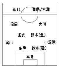 *→ とりあえずいちばんオーソドックスな布陣は、3-5-2。確実に前がかりのチームなので、バックスの3人の役割は非常に重要。ボランチの高木が大事なアクセント。山角や小笠原がオーバーラップしたときはしっかりフォローに入る。最終ラインは鈴木(蕃)がしっかり統率していて、崩すのは至難。