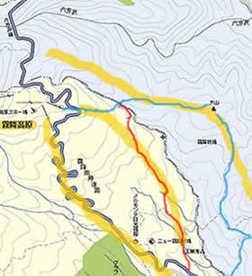 *→ 霧降高原の東側には、尾根が3本ほぼ平行して走っている。(黄色線参照)