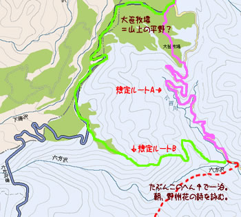 *→ 六方沢を越えた後のルートは、等高線からだと二通り考えられる。まず、上記の大笹街道沿いに小百川の崖上をよじ登って大笹牧場に出る道(想定ルートA)。