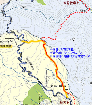 *→ まんなかの尾根を通る道は、現在ほとんどのガイドブックで「廃道」となっているが、これが「戊辰の道」、すなわち日光と会津を繋ぐ「六方越え」の旧道(赤線)。
